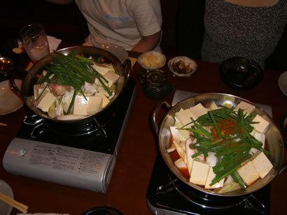 左:もつ鍋2種(塩、辛みそ) 右:しめは、ラーメンで