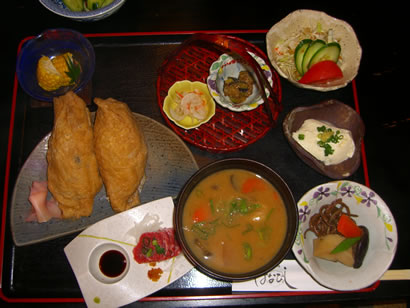 お昼に選んだのは、郷土料理の「はなびし」です。阿蘇地方伝統の「田舎いなり」がウリらしいので、田舎いなり御膳をいただきました。田舎いなりはおいしいけれどでかすぎて食べづらい・・・。だご汁(熊本郷土料理)や馬刺しも付いていて大満足。