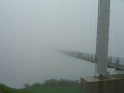 ここからちょっと距離がありますが、Mさんが以前正式オープン前(地元の人は渡れたらしい)に近くを通った「九重夢大吊橋」へ行きました。私は初めてでしたが、ここは、長さ、高さとも日本一の歩道吊橋で、橋の上からは絶景が見えるはずが・・・
